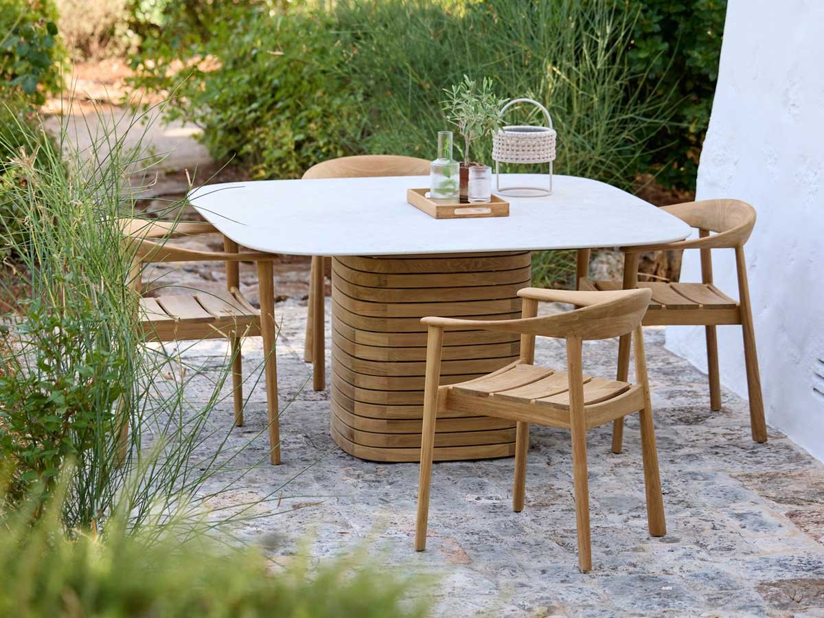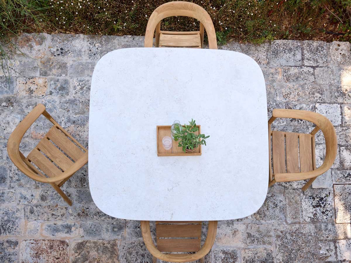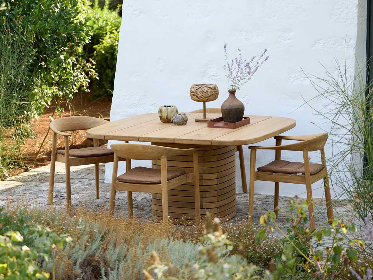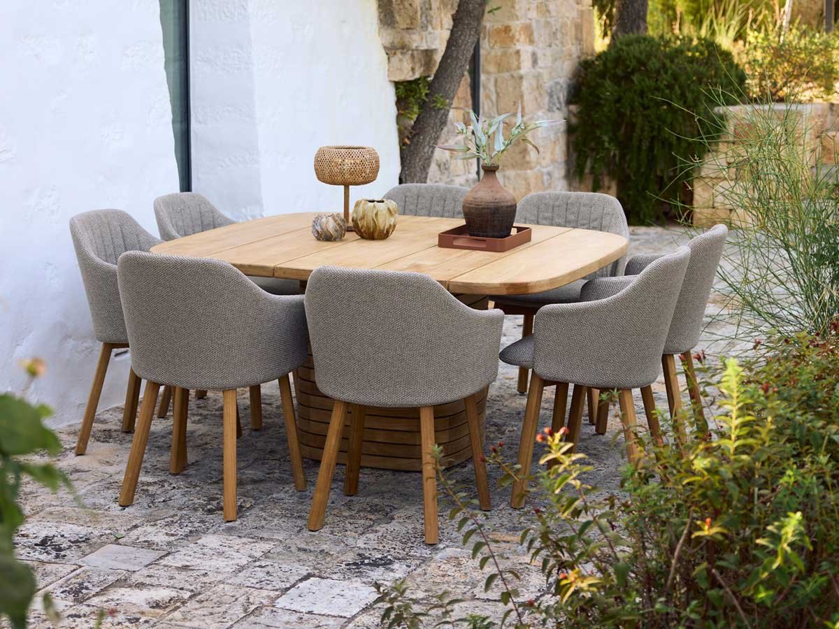 Med sin skulpturelle søjlebase og generøse bordplade (144 × 144 cm) med blødt afrundede hjørner sætter det kvadratiske Mellow spisebord fra Cane-line Design tonen for udendørs sammenkomster. Bordet har et karakteristisk og skulpturelt udtryk, der fungerer som et markant midtpunkt i spiseområdet — fra haveterrasser og gårdhaver til tagterrasser.
