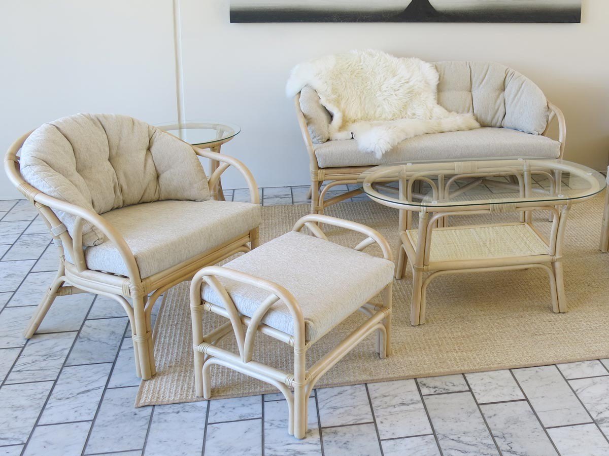 Gruppen består af lille 2-personers .sofa + 2 stole + ovalt sofabord med glasplade og flethylde. Tilkøb af nyttig fodskammel og praktisk hjørnebord er mulig.