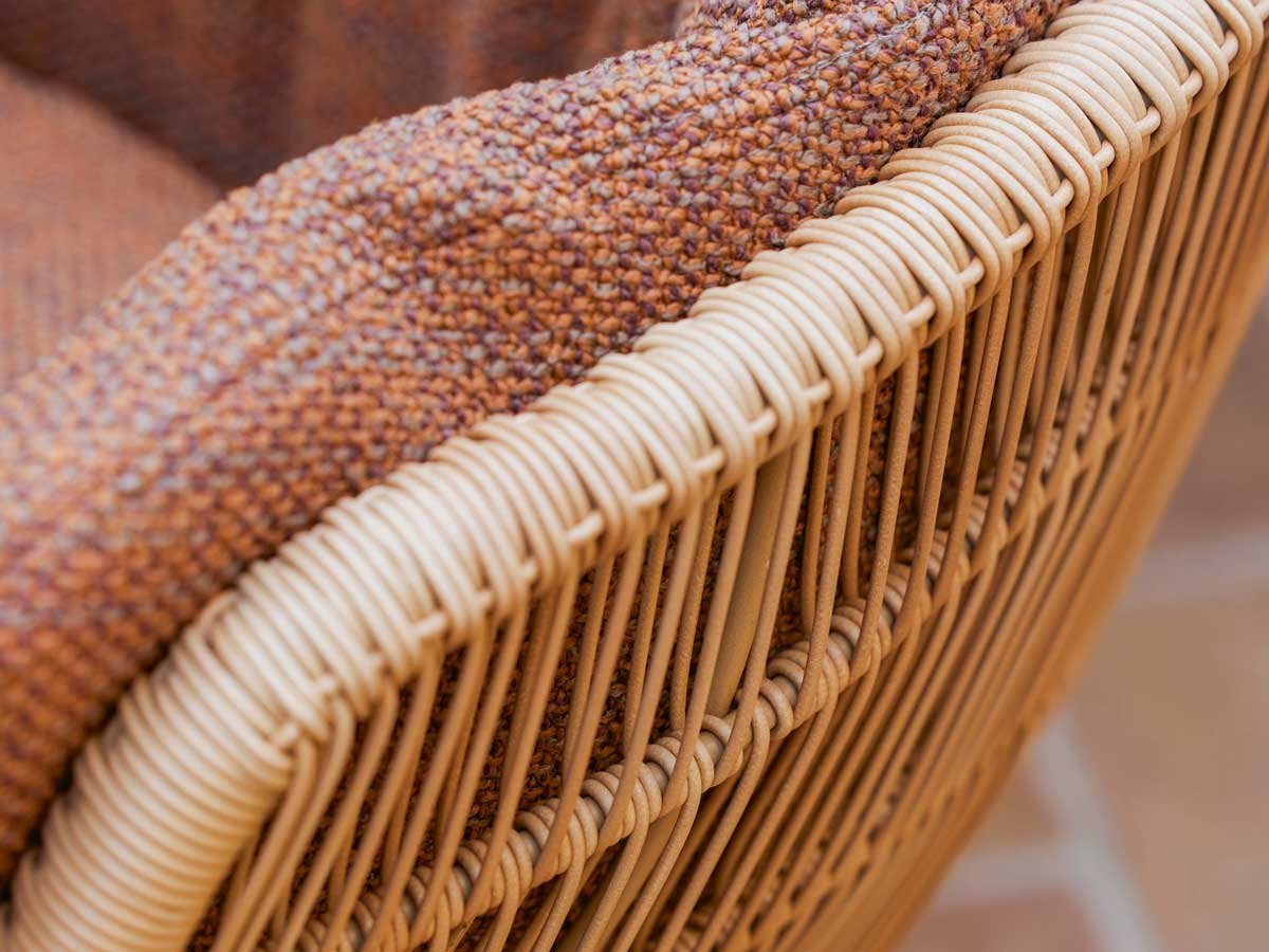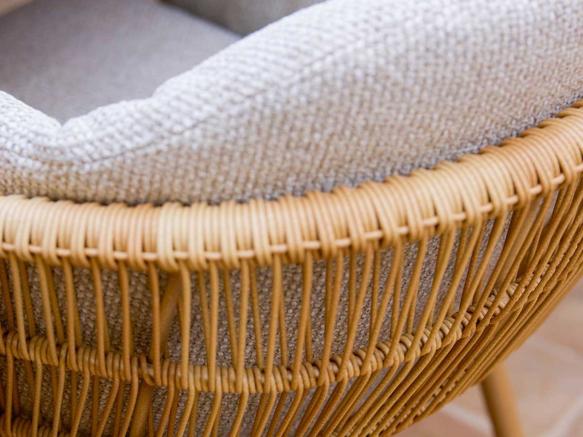 Med sin kurvede, rede-lignende form skaber stolen en hyggelig og omsluttende atmosfære, perfekt til afslapning eller stilfulde udendørs middage. Hynderne er udstyret med QuickDry & Airflow system, der sikrer, at de tørrer hurtigt efter regn og giver maksimal komfort. Stolens pulverlakerede aluminiumsben giver et moderne og solidt fundament.