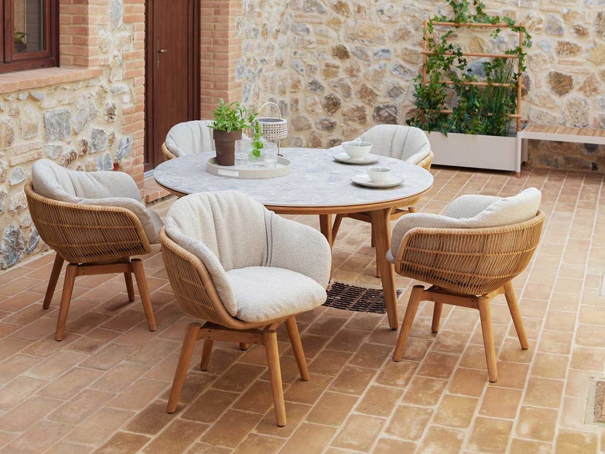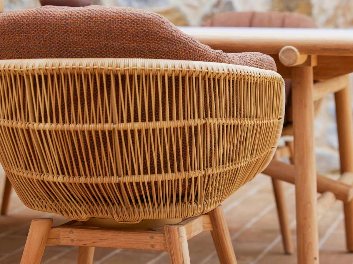 Stolen står på en solid teakbase med en elegant drejefunktion, der kombinerer fleksibilitet med stabilitet. De bløde hynder, som er udstyret med QuickDry & Airflow systemet, giver både enestående komfort og sikrer hurtig tørring efter regnvejr.