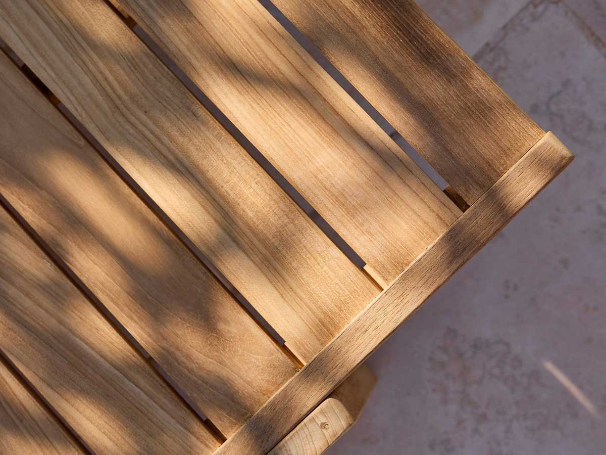 Over tid vil teaktræet naturligt få en smuk sølvgrå patina, hvis det står ubehandlet. Ønsker du at bevare den varme, gyldenbrune farve, anbefaler vi at bruge Cane-line Teak Care produkter.